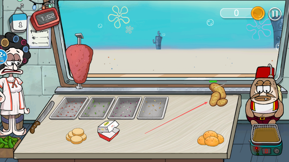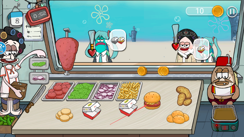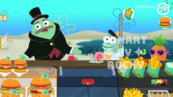 2、角色能力运用:解锁派大星后,安排其专注准备面包、生菜等基础食材,节省自身操作时间,遇到订单高峰时,触发章鱼哥的顾客耐心提升技能,避免顾客因等待离开。