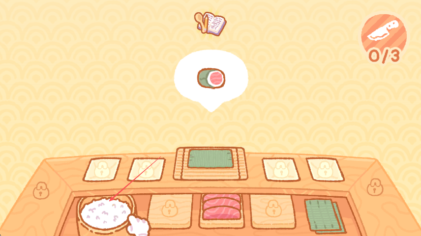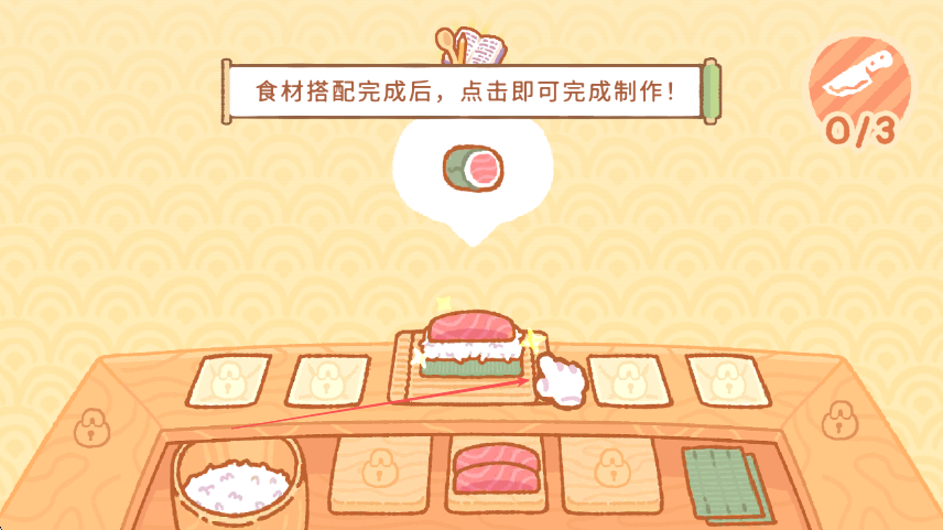 1、寿司制作流程:接到订单后,先查看萌宠顾客需求,从操作台选取对应食材,按步骤完成组合,先铺米饭、再放配料、最后卷裹或摆盘,确保食材搭配正确。