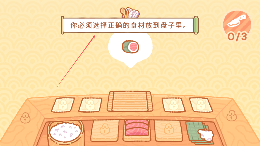 2、按照指引,选取米饭等食材,放置到操作区域,为制作寿司做准备。
