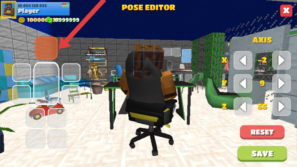 3、调整过程中,若对姿势不满意,可点击重置按钮恢复初始状态,当调整出满意的姿势后,点击按钮,将自定义姿势保存下来。