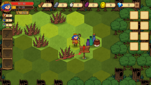 1、进入游戏查看屏幕上方血量值50/50及各类资源计数,操控角色在六边形地格场景中移动。