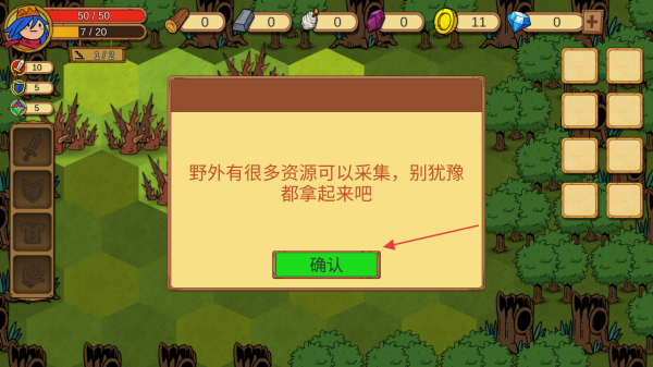 3、看到提示信息野外有很多资源可以采集,别犹豫都拿起来吧后点击确认,了解游戏机制。