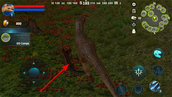 2、操控霸王龙靠近美颌龙等猎物,利用地图和虚拟摇杆精准定位目标,接近猎物是发起有效攻击的前提。