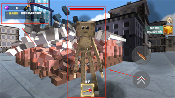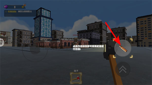 4、后续遇到敌人时,点击红色箭头指向的攻击按钮,使用武器发起攻击,完成消灭入侵敌人的任务目标,推进冒险进度。