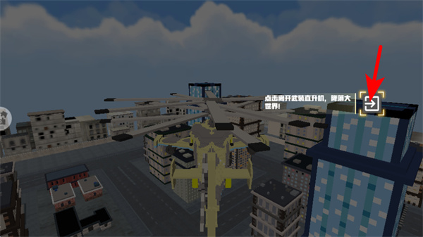 2、进入开放世界的直升机场景后,点击红色箭头指向的离开按钮,并降落至大世界场景,开启开放世界的探索流程。