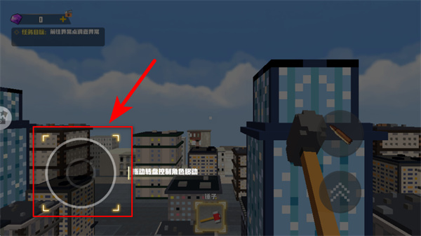 3、降落后,拖动红色箭头指向的转盘控制角色移动,朝着任务目标区域前进,熟悉开放世界的操控方式与场景布局。