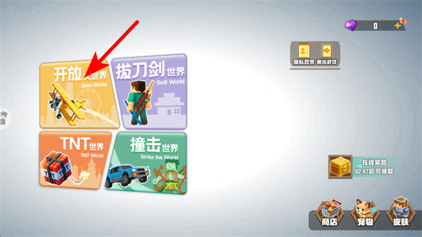 1、进入游戏主界面后,点击红色箭头指向的开放世界选项,选择该玩法模式,这是进入对应游戏世界的关键操作。