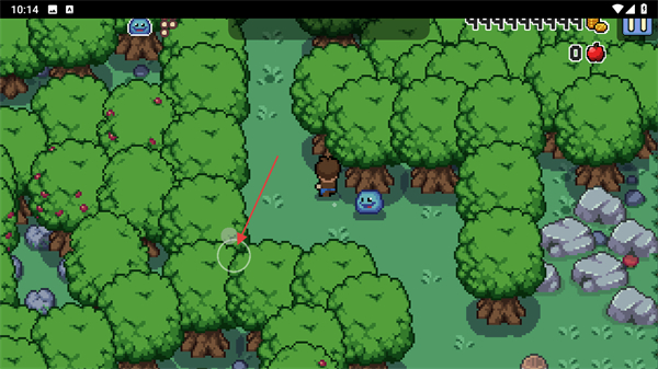 2、进入游戏的森林场景后,划动任意位置操控角色移动到指定的交互区域,与跟随的史莱姆伙伴一同探索地图内的内容。