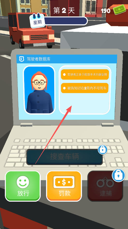 4、车辆停下后,查看驾驶者数据库信息,依据驾驶者违规情况,选择放行罚款或逮捕按钮进行处理,获取金钱或推进游戏进程。