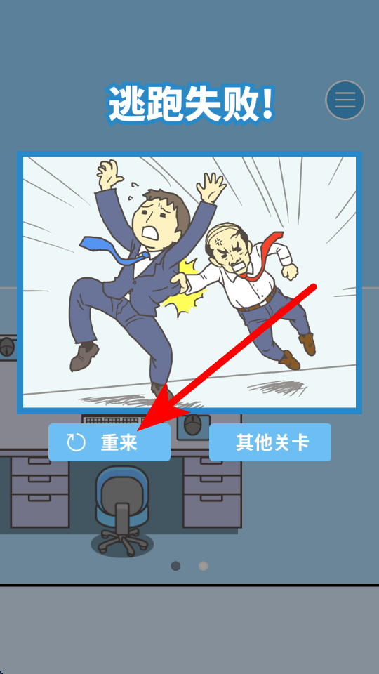 4、若在办公室逃脱失败,点击重来的按钮重新挑战当前关卡,通过多次尝试优化解谜策略,最终成功完成办公室逃脱。