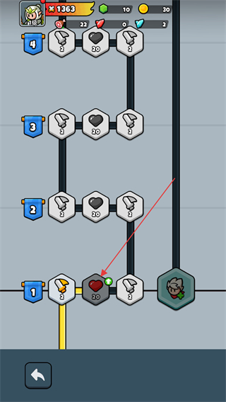 1、这是角色属性强化的层级界面,不同层级对应锤子、爱心等属性图标,点击1层的爱心图标,以此强化角色相关能力。
