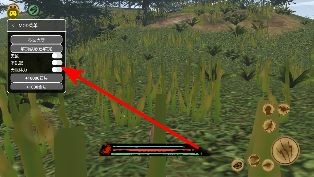 4、丛林冒险过程中,进行移动操作探索场景,同时能使用菜单,从中获取如无敌、无限体力等助力,更好地应对冒险中的挑战。