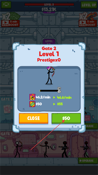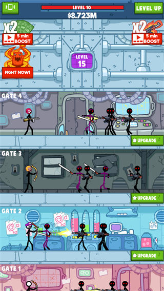2、根据需求选择是否花费金钱数量升级火柴人获取金钱的速度和每分钟的攻击伤害。