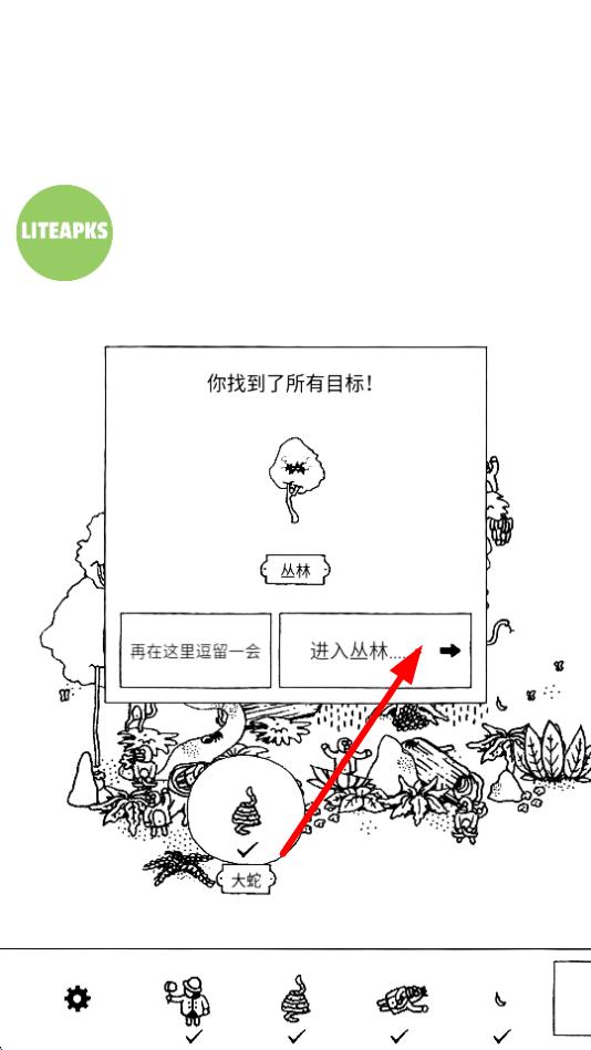 4、当找到所有目标后,点击进入丛林按钮进入下一场景,完成目标是解锁新关卡的关键,推动游戏探索进程。
