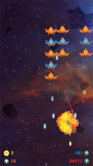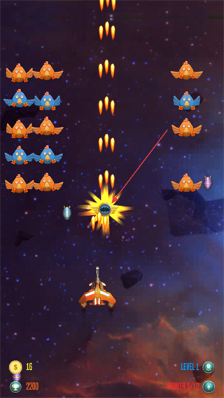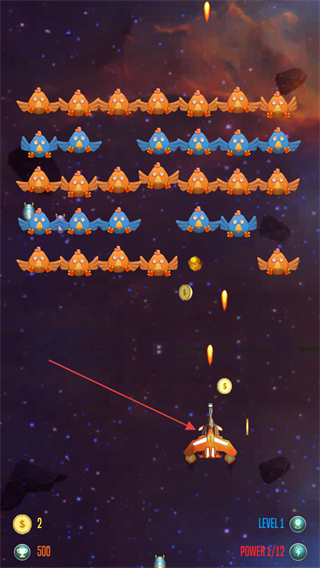 2、击杀小鸡后会随机掉落金色升级物品,获取后可以进行飞机的升级提升攻击力。