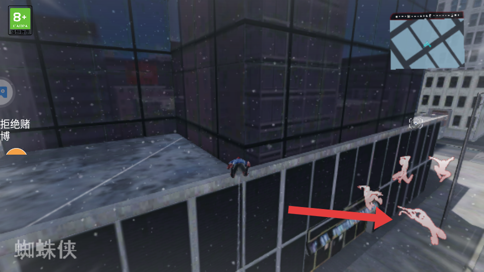 2、激活箭头指向的动作标识,让角色在高楼建筑群间施展动作,依靠蛛丝飞荡穿梭,遍历城市景观。