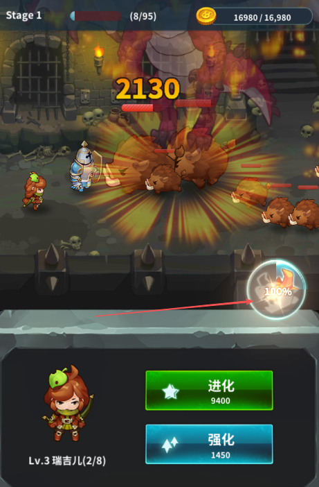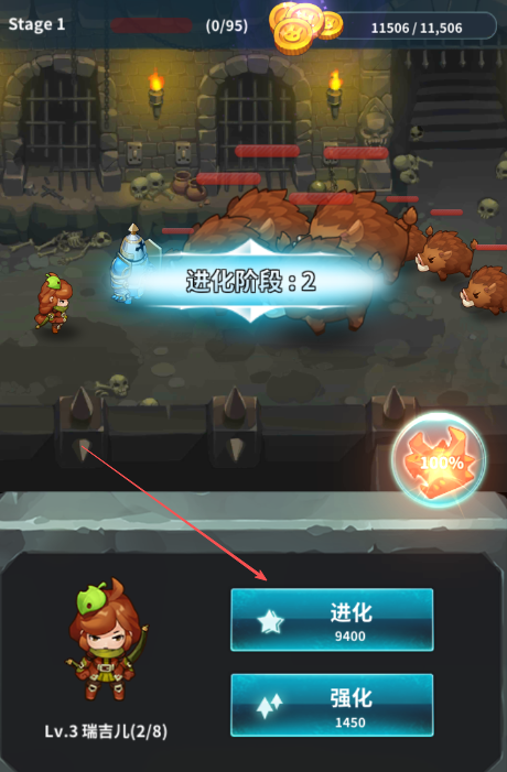 3、满足条件时点击进化按钮消耗金币让瑞吉尔进化提升实力。