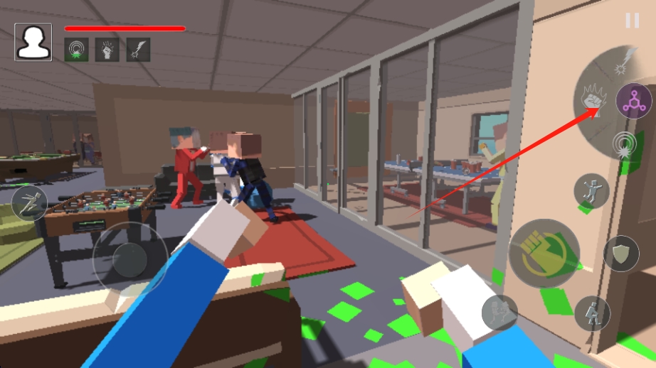 1、游戏中,点击右侧拳头图标,可发动近战攻击,用应对近距离的敌人或障碍物,近距离战斗手段。
