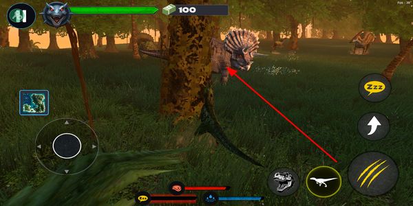 3、在场景中遇到其他恐龙时,点击攻击按钮发起进攻,利用恐龙的能力对抗目标,提升自身在场景中的生存优势。