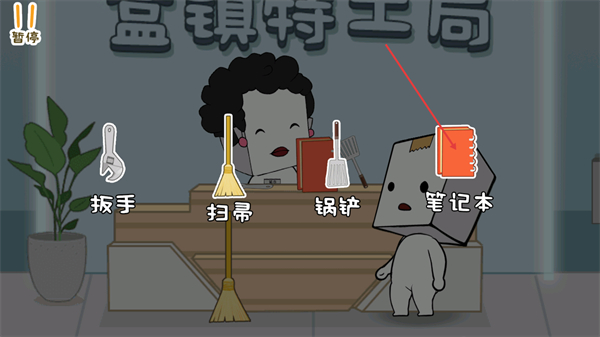 3、处于盒镇特工局的场景中,点击界面标注的笔记本,互动该物品可获取相关任务信息,同时还能看到扳手扫帚等其他可互动道具。