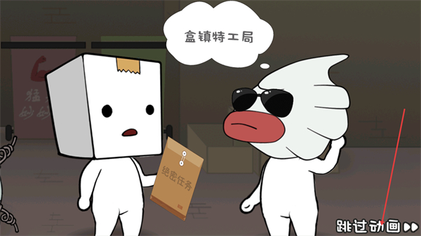 2、在当前剧情动画界面中,可查看角色关于盒镇特工局的想法,同时若想快速推进,可点击界面的跳过动画按钮来略过这段剧情。