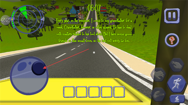 1、通过左侧轮盘操控角色移动,沿道路向爷爷家前进,注意界面的时间进度08:07。