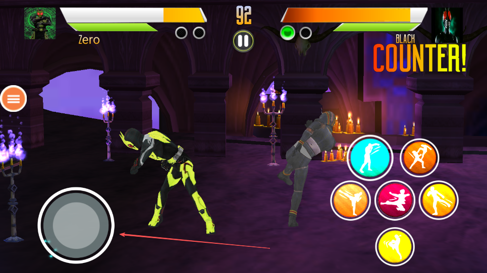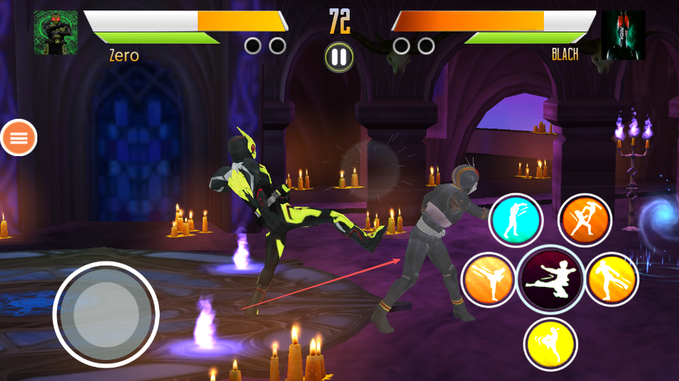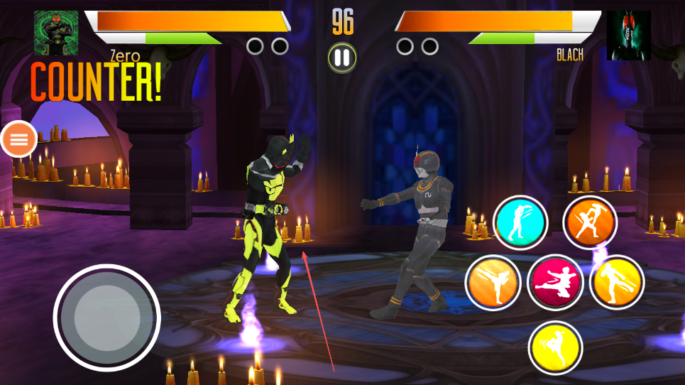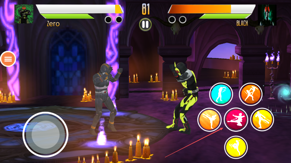 2、屏幕右侧分布着不同颜色的技能按钮,代表不同的攻击技能,点击技能按钮释放相应技能,比如踢击、拳击等。