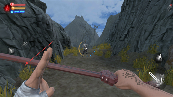 1、在该游戏场景中,将视角对准前方出现的敌人,通过界面左侧的移动区域调整位置,为后续攻击该敌人做好准备。