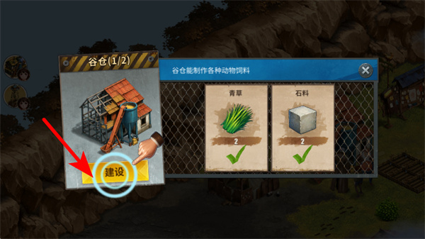 3、材料收集完成后,点击红色箭头指向的建设按钮,即可开始修复谷仓,推进任务进度。