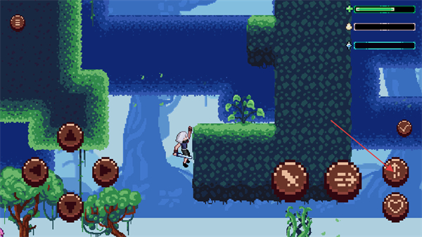 1、在悬崖边上,点击跳跃键靠近墙面可以进行攀爬,挂在悬崖上躲避攻击。