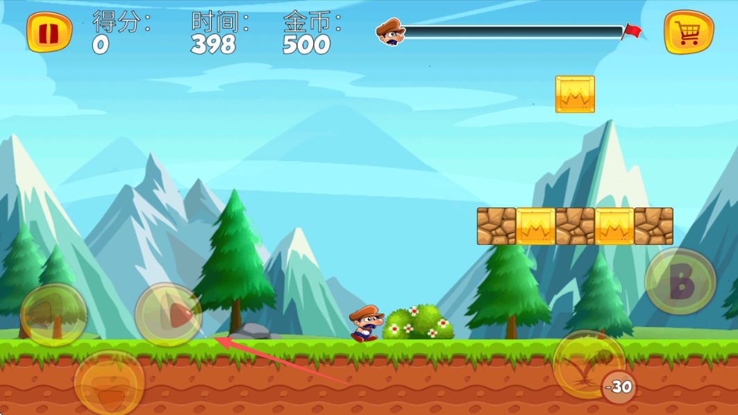 1、进入游戏,查看上方的得分,时间,金币数量,通过左下角方向键操控角色移动。