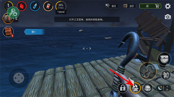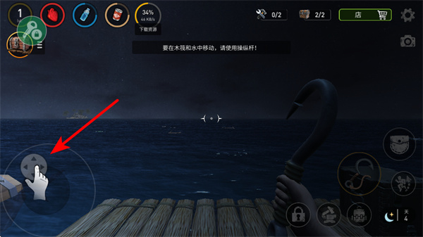 1、游戏中通过左侧虚拟摇杆操控木筏移动,这是在水域中探索、收集资源的基础操作,确保准确到达区域。