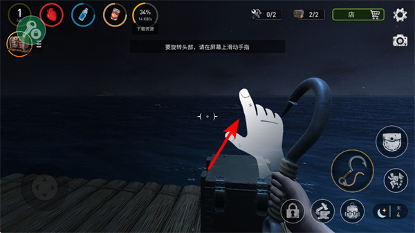 2、滑动屏幕可旋转头部视角,这是观察周围环境、发现资源和危险的关键操作,需全面查看水域远处情况。