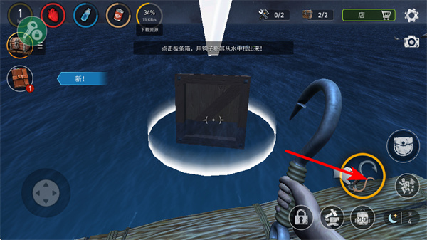 3、点击钩子道具可打捞水中的板条箱,这是获取资源的关键操作,打捞时需瞄准板条箱,确保钩子准确钩取。