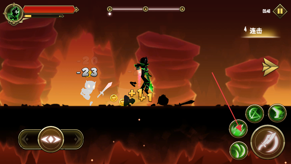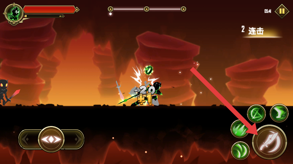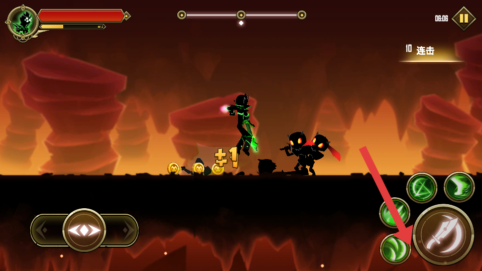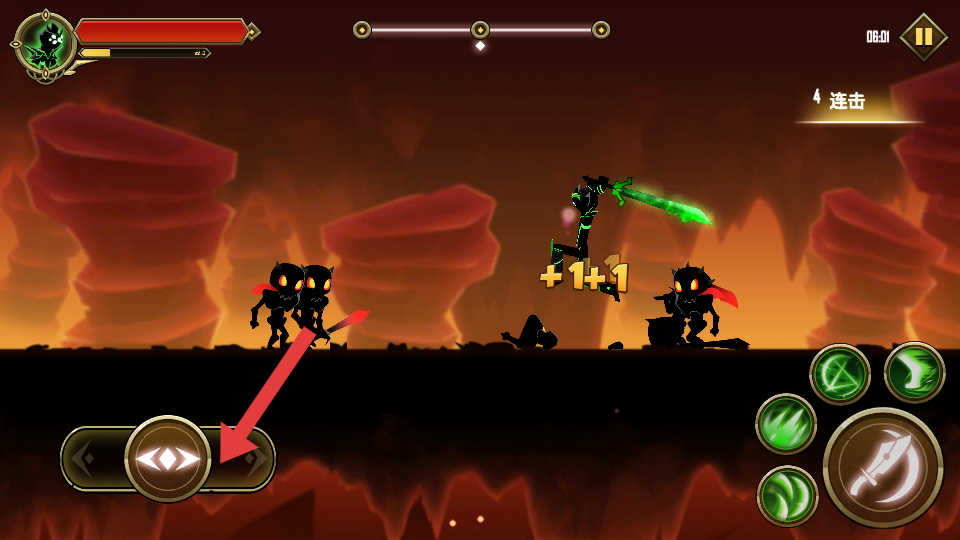 3、若角色解锁技能,当屏幕下方技能条充满后,点击对应技能按键释放特殊攻击,怪物造成大额伤害,缩短时间。