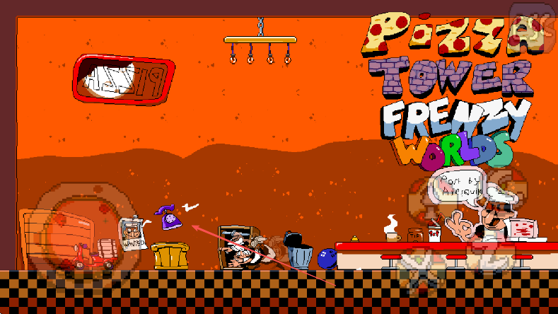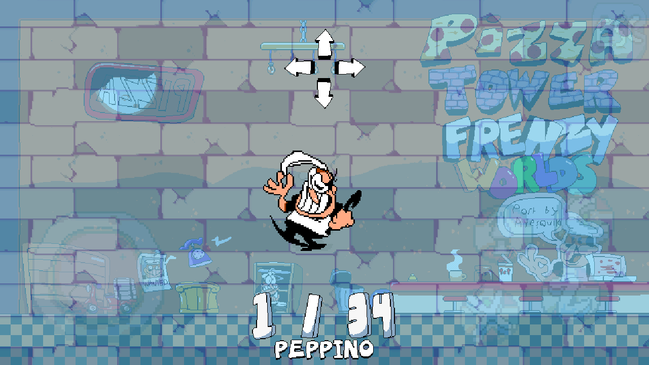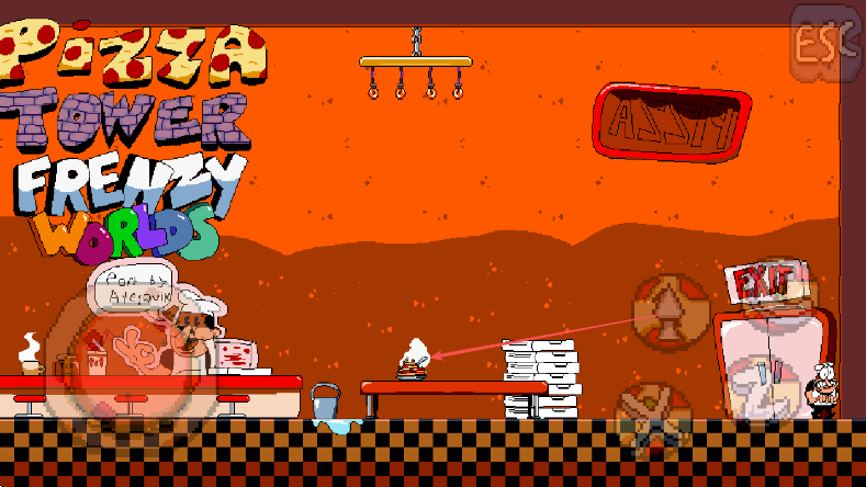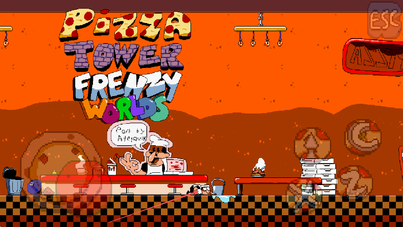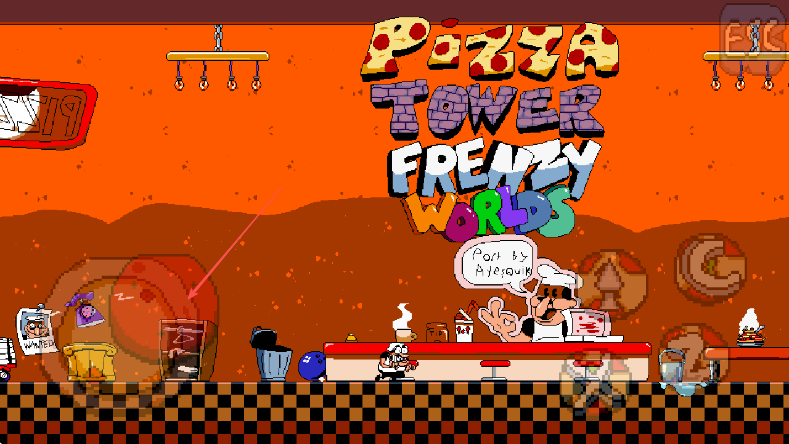 1、进入PizzaTowerFrenzyWorlds游戏,观察披萨店场景和角色位置。