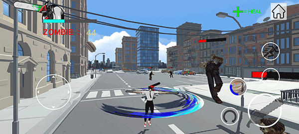2、多样化操作与简易战斗:通过虚拟按键实现移动、跳跃、翻滚、攻击、技能释放等多样化操作,操作逻辑清晰易懂,同时僵尸仅有一种攻击模式。