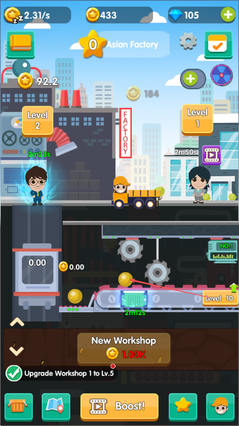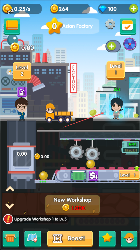 3、升级车间和设施,提高生产效率,同时关注上方角色状态,适时安排其工作。