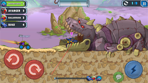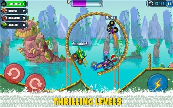 采用横版视角呈现赛车闯关过程,操作逻辑清晰直观,通过简单的操控实现车辆加速、减速、跳跃等动作,兼顾操作乐趣与闯关策略性。