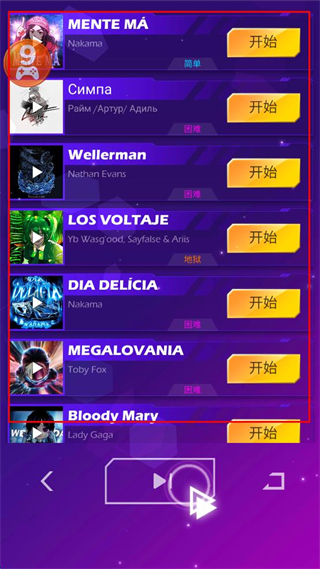 4、结束当前关卡后,在曲目列表中选择喜欢的曲目,点击“开始”进入新关卡。