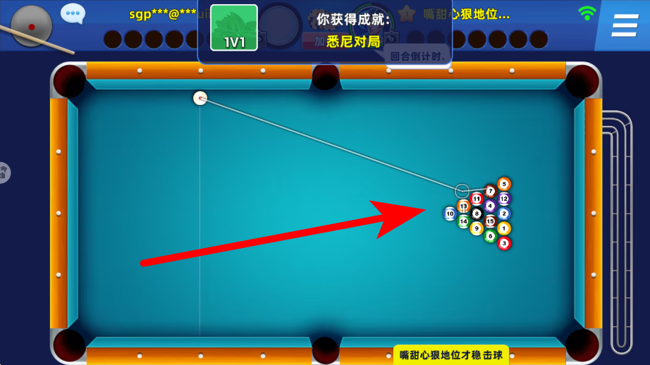 4、参与对局时,在台球桌上,根据台球的分布情况,运用移动球杆、调整力度等操作,参与1V1等对局,体验台球竞技的乐趣。