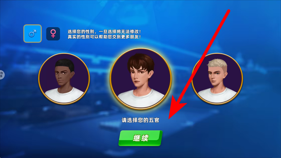 3、角色创建时,选择自己的性别,再挑选五官等,打造出个性化的角色形象,之后点击继续,开启台球游玩之旅。