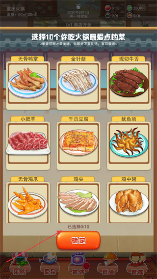 1、进入游戏,起好火锅店的名称后,可以选择10个爱吃的火锅菜作为火锅店的售卖商品。