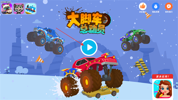 1、这是大脚车总动员的启动界面,界面展示了多款大脚车元素,点击中间的播放按钮可进入游戏。