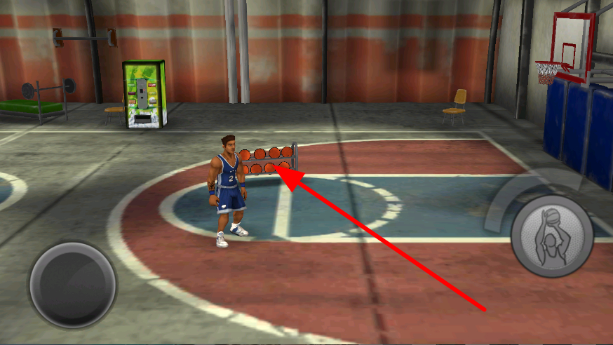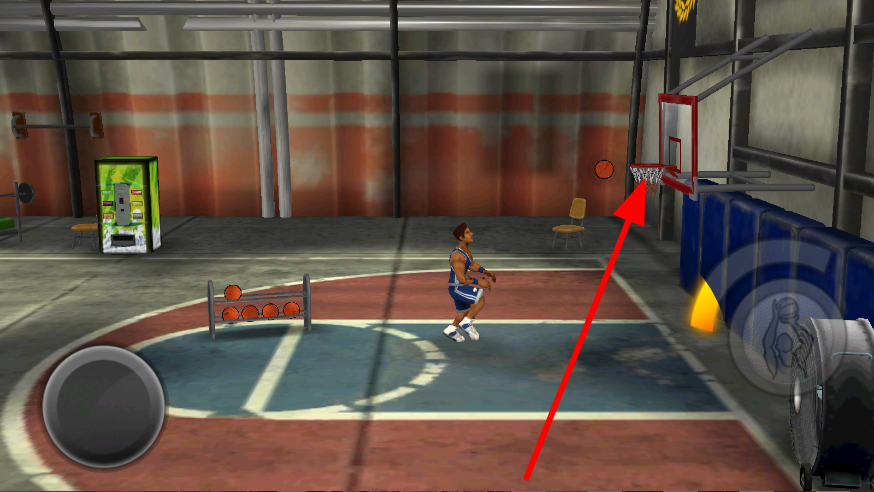 2、简单的操控角色移动到篮球架旁,靠近放置篮球的架子,便能拿取篮球,拿到篮球后,就可以准备进行投篮操作。