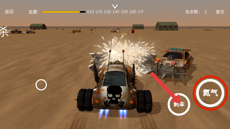 1、操控车辆冲向敌方密集区域,利用左侧虚拟按键快速调整方向,让车辆自身武器装备频繁撞击敌方车辆,快速积累击杀数,获取升级经验。