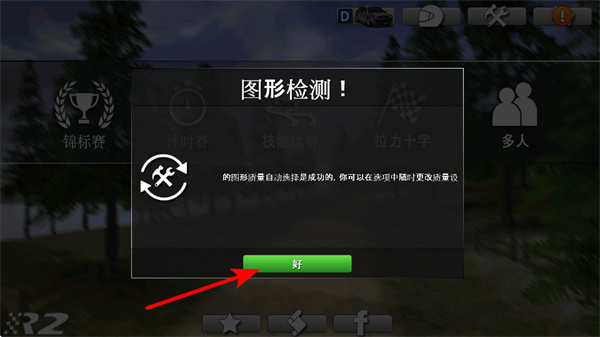1、在游戏中,点击好按钮完成图形检测,检测完成是进入游戏的关键操作,点击可正式开启赛车生涯,体验赛车模式。
