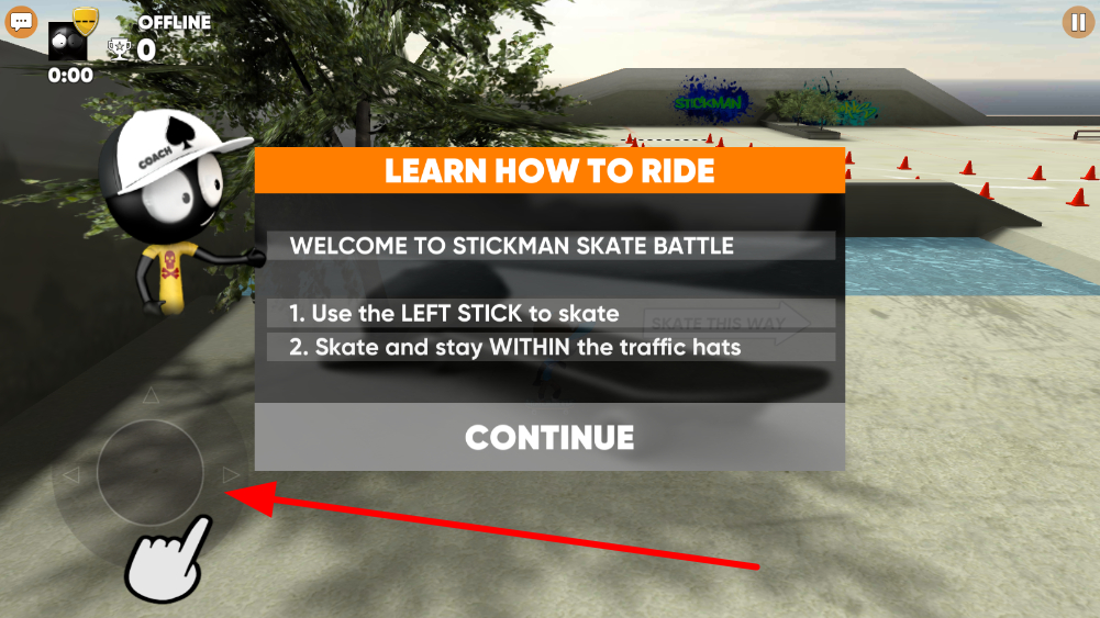 1、开始有操控教学,通过左侧摇杆来操控火柴人滑板移动,在移动过程中,要尽量让滑板保持在交通锥等标记的范围内,熟悉滑板的基本操控。