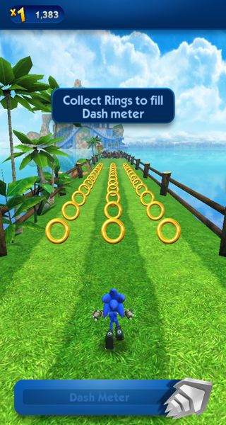 1、遇到岔路或障碍,向左滑动屏幕,让索尼克向左移动,避开阻碍,继续在跑道上奔跑,收集沿途道具。