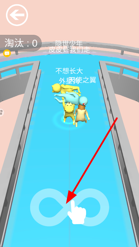 3、赛道上,会遇到其他参与的角色,按照提示比如点击标识,把其他角色抬起扔出赛道,将它们从赛道上淘汰,提升自己的淘汰数。